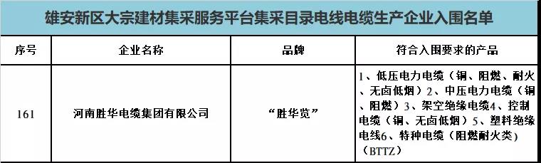 为进一步保障新区工程建设所需电线电缆产品供应质量,根据《雄安新区建筑材料集中采购管理暂行规定》《雄安新区大宗建材集采服务平台供应商管理细则(试行)》《雄安新区大宗建材集采目录入围指标体系(电线电缆 篇)》,经企业自主报名、专家评审后,河南胜华电缆集团成为首批入围雄安新区大宗建材集采目录的电线电缆企业。